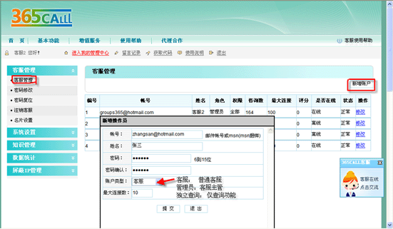 輕松管理網(wǎng)站的客服成員。 登錄kf000在線客服系統(tǒng)網(wǎng)站,進(jìn)入管理中心,點(diǎn)擊“客服管理”,可“新增賬戶”進(jìn)行添加客服: