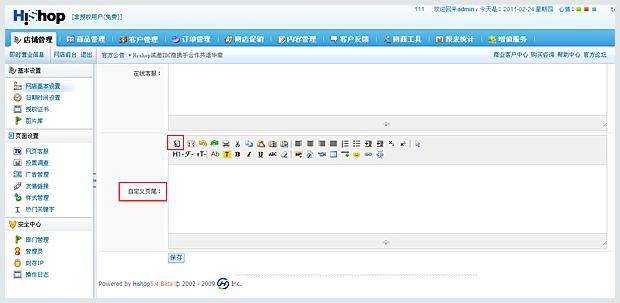獲取在線客服安裝代碼,然后登陸Hishop后臺(tái),進(jìn)入店鋪管理》網(wǎng)店基本設(shè)置,找到“自定義頁(yè)尾”,點(diǎn)擊“HTML代碼”按鈕,把在線客服代碼復(fù)制粘貼到編輯框,點(diǎn)擊保存。
